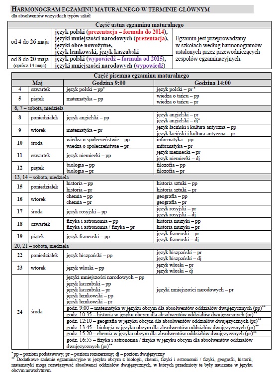Dodatkowe terminy pisemnych i ustnych egzaminów maturalnych wyznaczono od 1 do 20 czerwca. Wyniki matur zostaną ogłoszone 30 czerwca. Maturalne egzaminy poprawkowe pisemne przeprowadzone będą 22 sierpnia, a ustne w dniach 23-25 sierpnia.