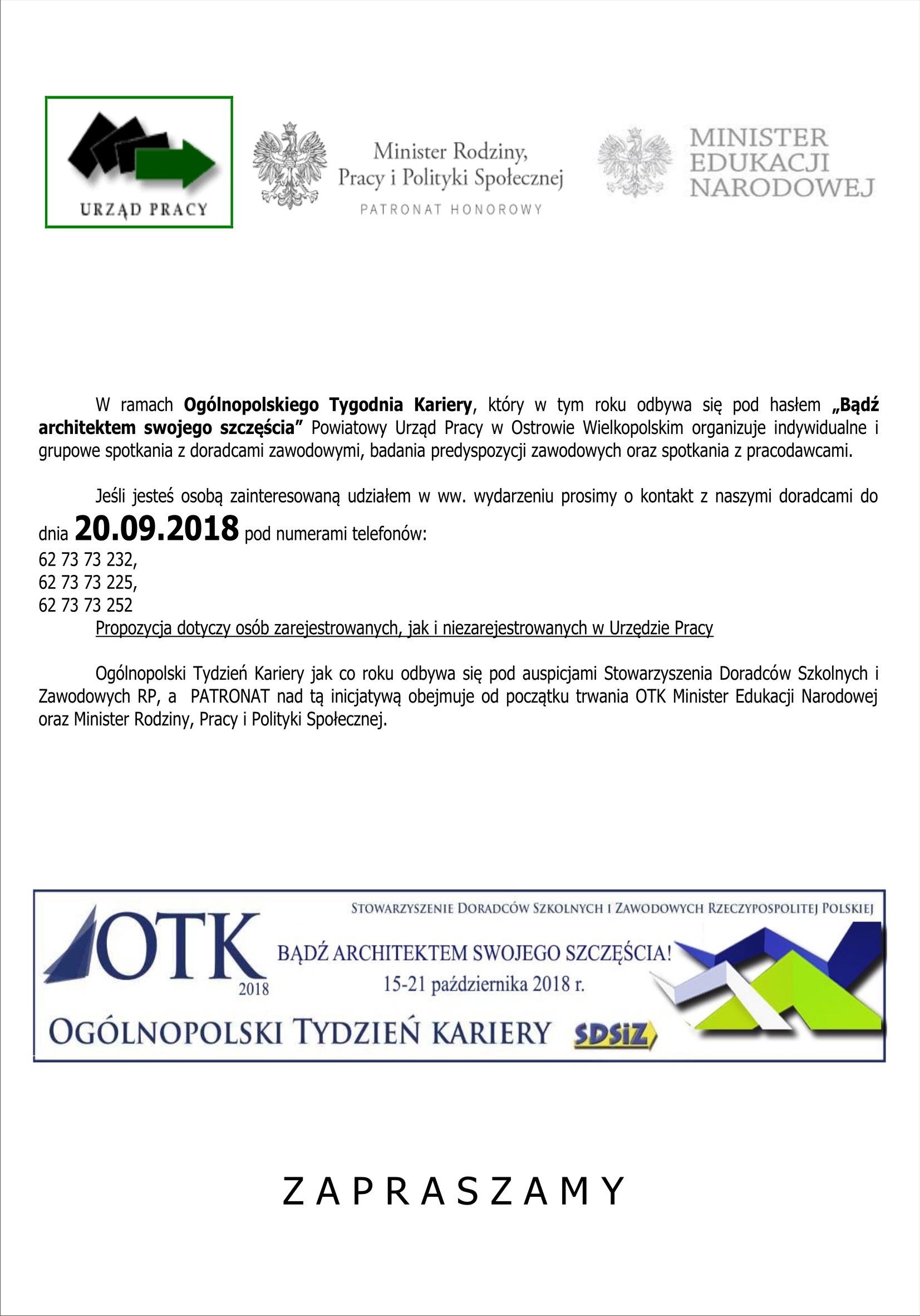 Powiatowy Urząd Pracy w Ostrowie Wielkopolskim w dniach od 15.10.2018 r. do 19.10.2018 r. ponownie przystąpi do realizacji Ogólnopolskiego Tygodnia Kariery, który w tym roku odbędzie się pod hasłem: „Bądź architektem swojego szczęścia!".