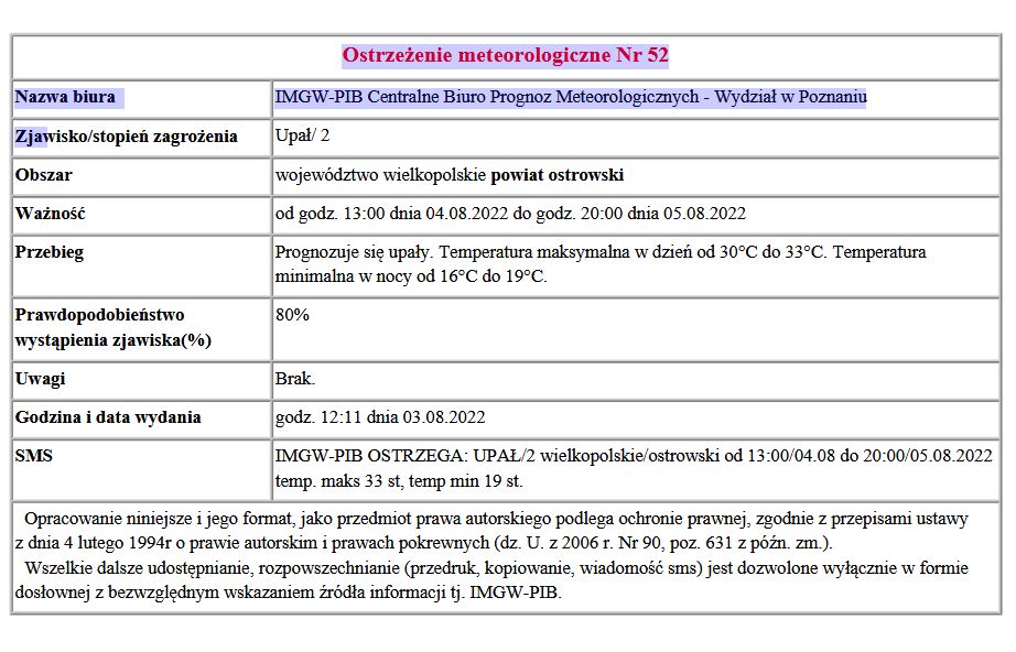 Instytut Meteorologii i Gospodarki Wodnej ostrzega przed upałami, które mogą być groźne jeszcze w najbliższym czasie. Szczegółowy komunikat w załączeniu.